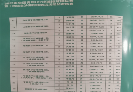 6月10日-13日,2021年全国青年U17沙滩排球锦标赛暨第十四届全国运动会沙滩排球青年组资格赛在武汉市汉阳区汉阳江滩沙滩排球中心举行。该赛事是第十四届全国运动会沙滩排球青年组资格赛,最终决出西安全运会参赛队伍,共有来自四川、福建、海南、辽宁等15个省、直辖市的54支队伍参赛,争夺陕西全运会出线权。
